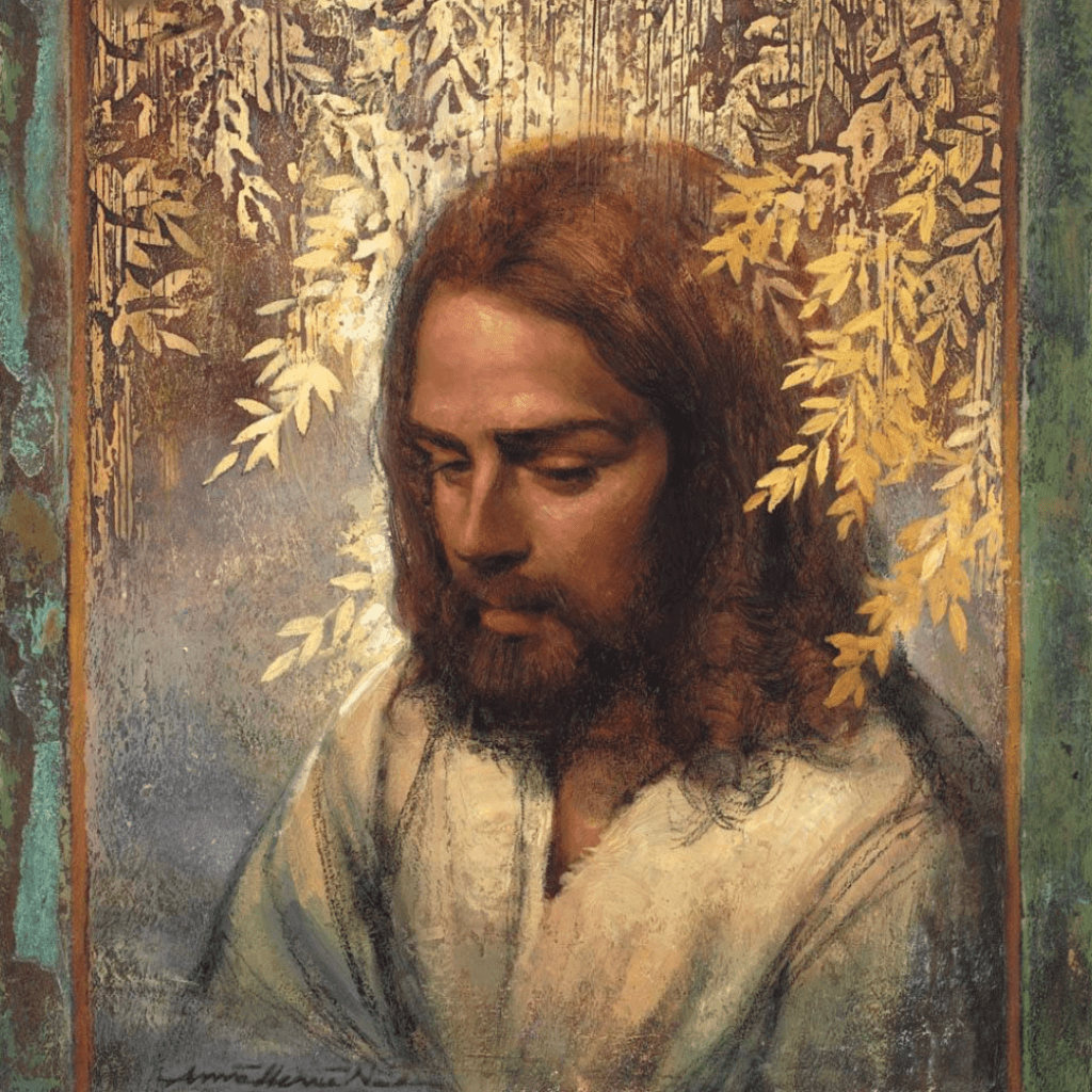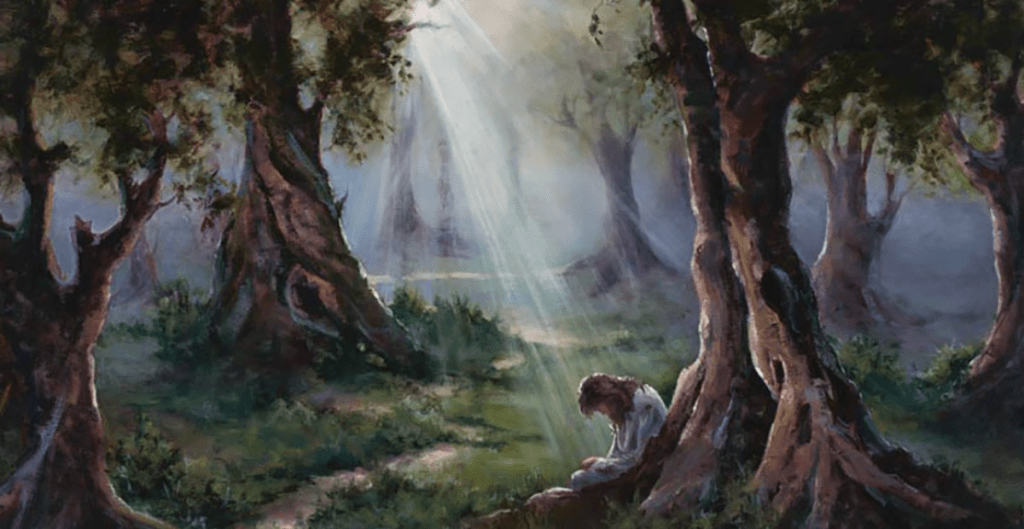 Jesus walked further and further into the garden. Finally, he came to a tree that looked as though it had lived a thousand years. Its branches were twisted and gnarled, and its leaves hung in streaming waves to the earth. Its trunk was thick enough to wrap your arms around three times over, and it reached tall into the sky. It was a wise, kind old tree. When Jesus approached, the tree dropped her branches just a little to make a space for him. Jesus knelt in front of the tree and looked up into her branches stretched out like arms. Between the tree’s branches, stars dotted the darkening sky. Jesus gazed up into the night, watching the stars twinkling within the shadowy leaves of the wise old tree, for a long time. Then, he began to speak.
